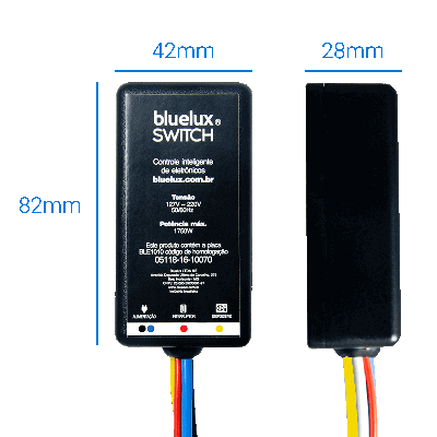 Cada Bluelux Switch se conecta por Bluetooth Low Energy para ligar ou desligar equipamentos eletrônicos como TVs, ar condicionado ou freezer no local pelo app, com potência máxima de até 1750W.